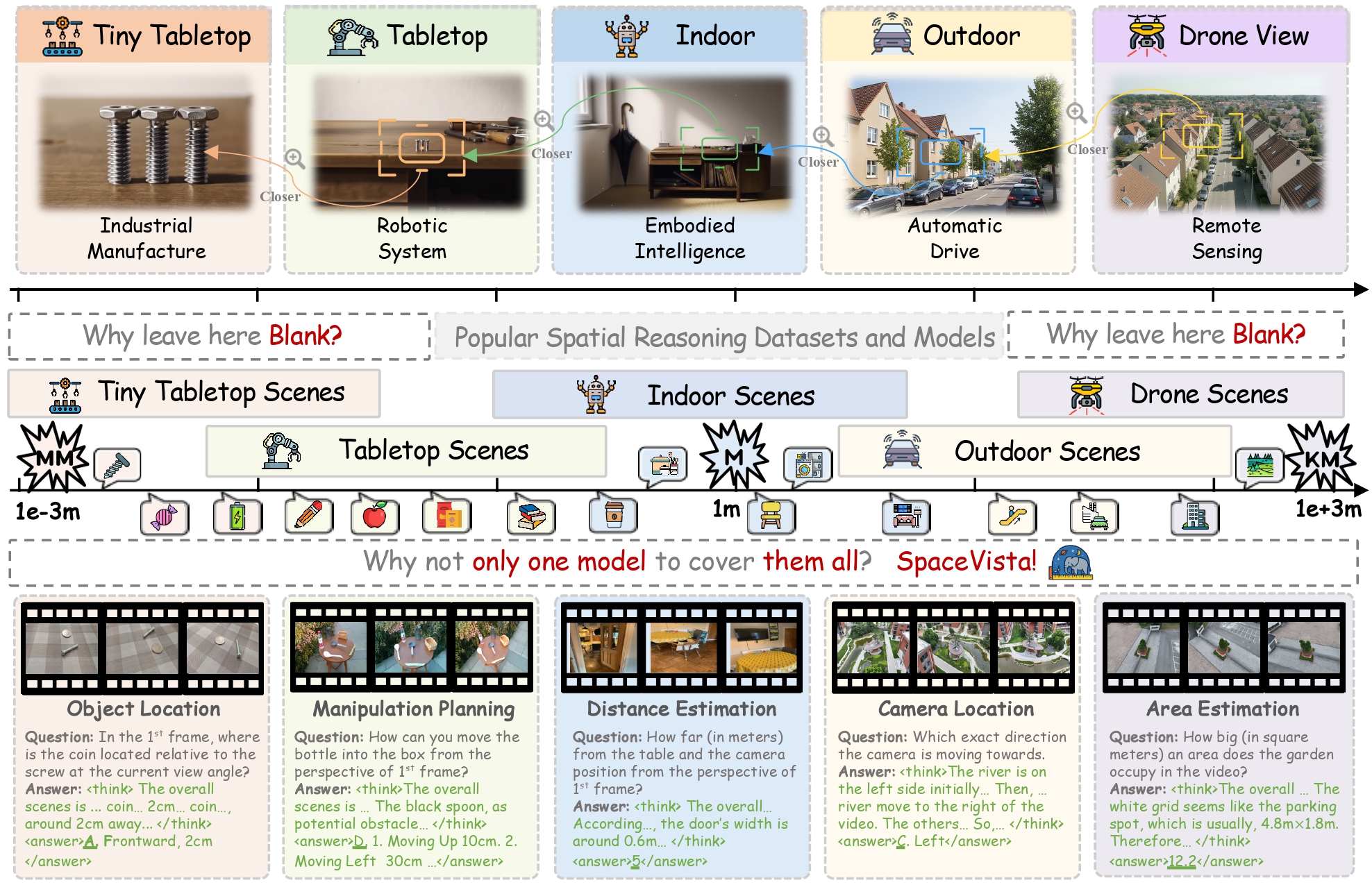 narrow object classes, and limited spatial ranges, and lacks training paradigms engineered for end to end, cross scale reasoning. SpaceVista addresses